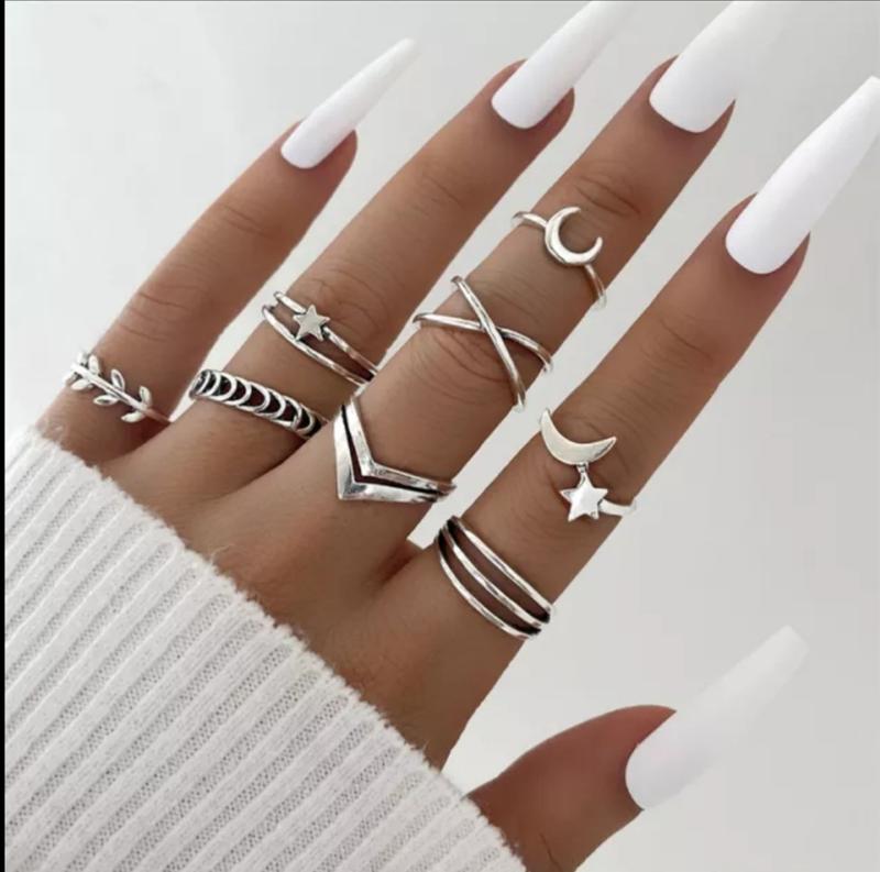Ефектний набір з 8-ми вінтажних колечок в стилі бохо, етно. Колечка будуть гарно виглядати як разом, так і окремо. Кільця різних розмірів, щоб можна було носити на різних фалангах пальців. Матеріал: біжутерний сплав Колір: срібний Відправка Новою або Укрпоштою