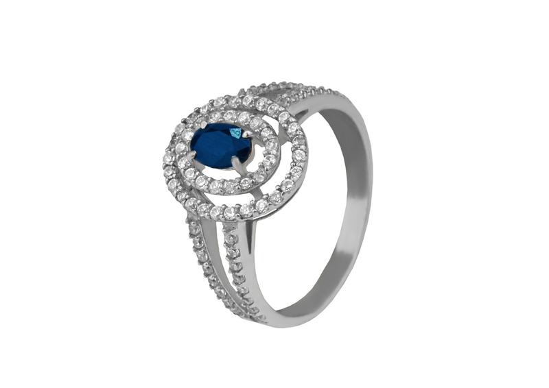 Кільце срібне з натуральним сапфіром Ауреліо Срібло 925 проба. Вага 3.22 г. Ширина 14 мм. Висота над пальцем 6 мм. Вставки: овал 4*6 мм (1 шт.), коло 1 мм (75 шт.) безбарвний, синій куб. цирконій, сапфір 1582/9р сапфір АГНІ родований 18(р)