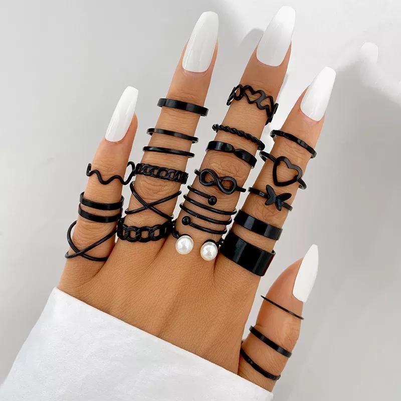 Набор черных колец из 22-х штук, размер регулируется, цинковый сплав