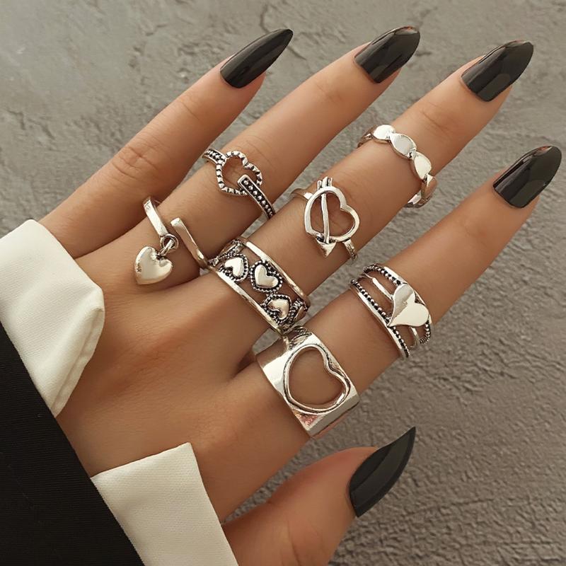 Зустрічайте новинку! Дуже крутий набір із семи найактуальніших моделей каблучок-сердечок. У наборі 5 кілець з розмірами, що регулюються, і два кільця в розмірі 16. Колір: срібло. Склад: біжутерний сплав. Кількість у наборі: 7 шт. Розмір: регульований+2 кільця 16р. Ви тільки вдивіться в ці незвичайні обручки! Вони так стильно і красиво виглядають, чи не так?)