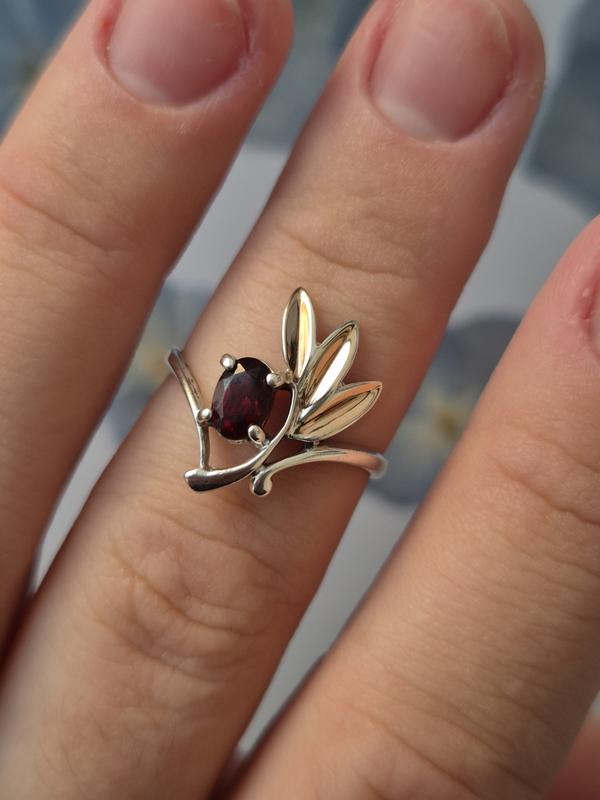 Неймовірно красива каблучка із срібла із позолотою. Є проби 925 і 375 тризуб. Вага - 2,3 грам Розмір - 18 Вставка - натуральний гранат. Гранат - це символ пристрасті і сили. Згідно вірувань, покращує артеріальний тиск. Стан нового!