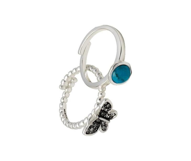 Елітна ювелірна біжутерія ручної роботи PILGRIM (Данія) Набір з 2-х ніжних жіночих каблучок. Одне з метеликом - посріблене із кристалами. Друге – з бірюзою, теж посріблене. (Нове з етикеткою). Можна носити як на одному пальці, так і поруч. Розмір: Універсальний регулюється. Матеріал: ювелірний сплав із напиленням срібла, кристали, бірюза. Бірюзу завжди вважали каменем щастя. Цьому каменю приписують багато магічних та лікувальних властивостей. Він розсіює негативну енергію, приносить спокій і душевну рівновагу, і його можна носити для захисту від зовнішніх впливів.