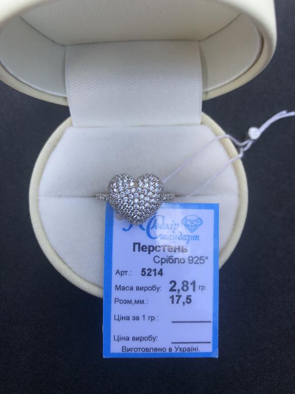 Каблучка Серце з Фіанітами Маса виробу 2,81 гр Розмір виробу 17,5 мм Ціна виробу 280 грн
