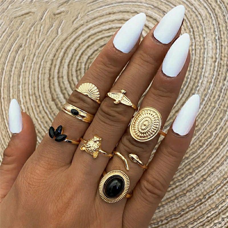 Приголомшливий набір з восьми кілець у золотому кольорі! Ефектний і оригінальний набір кілець. У наборі вісім кілець, різних розмірів: від 17 до 18.5. Склад: бижутерный сплав. Колір: золото. Ви тільки вдивіться в ці незвичайні обручки! Вони так стильно і красиво виглядають, чи не правда?