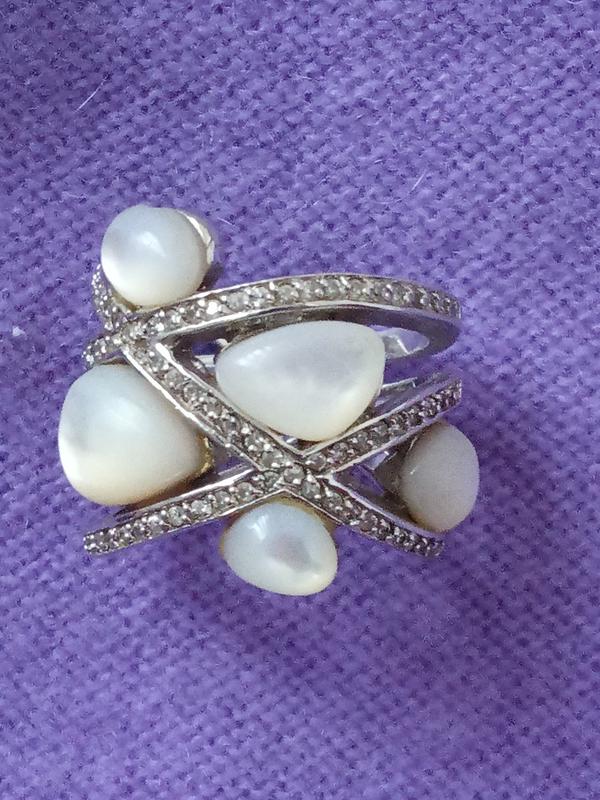 Велика важка срібна каблучка оригінального дизайну. Виконано з срібла 925 проби, Покриття- родій. Доповнено білим камінням та фіанітами. Розмір приблизно 17. Стан відмінний. Привезено із Швейцарії.