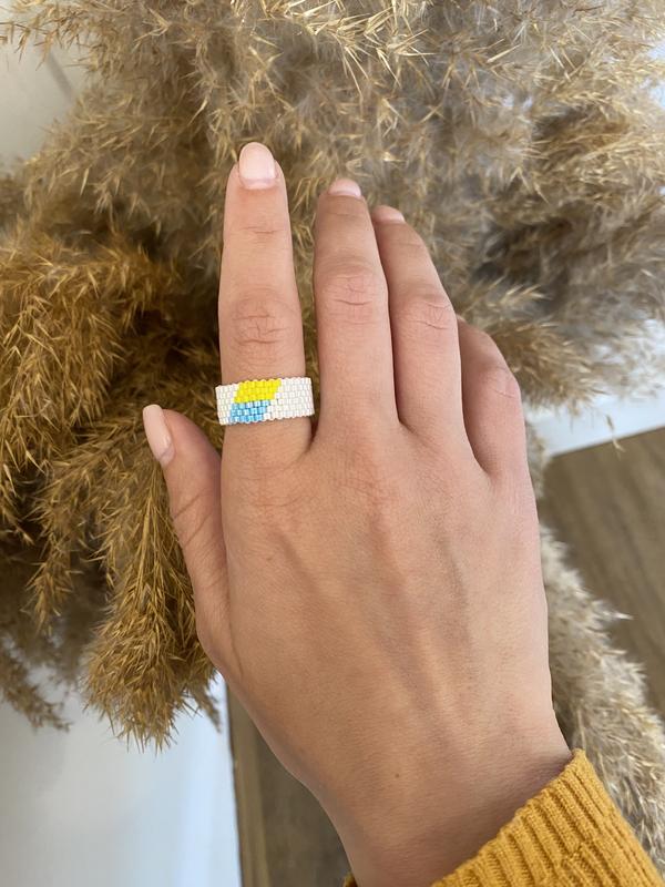 На білому особливо яскравими здаються кольори українського прапора. Ідеальне кільце для тих хто хоче колечко в патріотичному стилі. Колечко виконано з японського бісеру преміального класу. Виконується за Вашими замірами