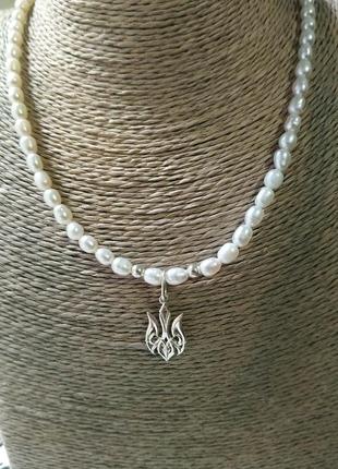 Намисто з натуральних річкових перлів зі срібним тризубом. Довжина 38- 45 см.