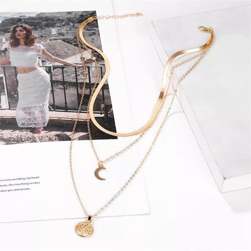 Дуже ефектне, оригінальне і універсальне потрійне кольє-чокер з підвісками. Широкий ланцюг-змія+два ланцюжка з різними підвісками: місяць, та дерево. Виглядає, просто приголомшливо! Склад: біжутерний сплав. Довжина: змія-36см, ланцюжки-41см і 50см +5см додаткові ланки, щоб можно булу регулювати довжину. Колір: золото ( є в срібному кольорі, наявність уточнюйте перед замовленням)