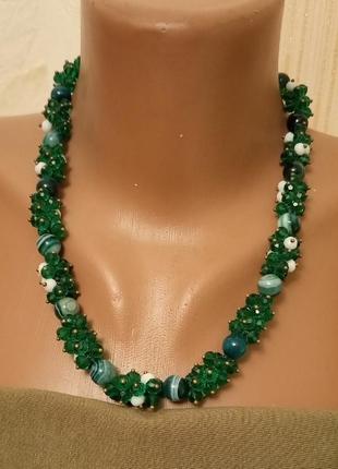 колье з зеленого агату та чешського хришталю. фурнітура бронза застібка магніт. довжина 50см.