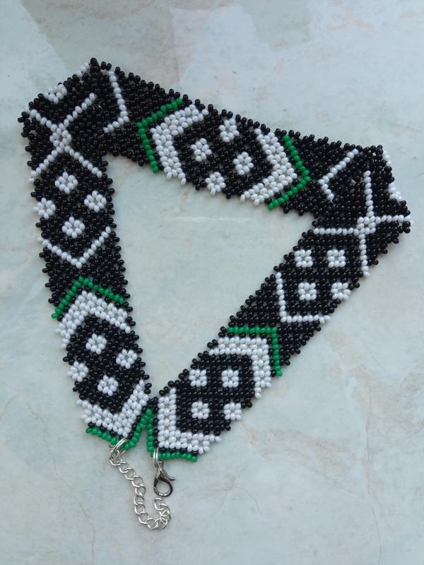 Гердан довжиною 33 см +4 см подовження ланцюжком., ширина 2 см. Орнамент наближений до відомого гердану Лесі Українки. Виконан з чеського бісеру.