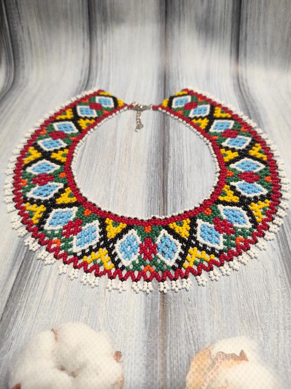 Длина изделия 42см+5см цепочка, ширина 5см. Выполнена из чешского бисера.