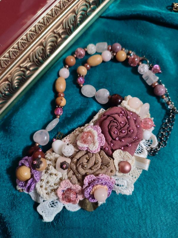 Ніжне квітково-мереживне кольє в стилі бохо, виконано в поєднанні пудрово -рожевих і бежевих та бордових кольорів. Композиція зібрана з бавовняної пряжі, мережива, репсовых стрічок і ніжного французького шовку. Декороване кольє натуральними намистинами з каміння, кришталю та дерева. Вироблена українською майстринею. Довжина кольє - 34 см+18 (подовжувач ланцюжок), розмір квіткової композиции - 13 * 6 см.