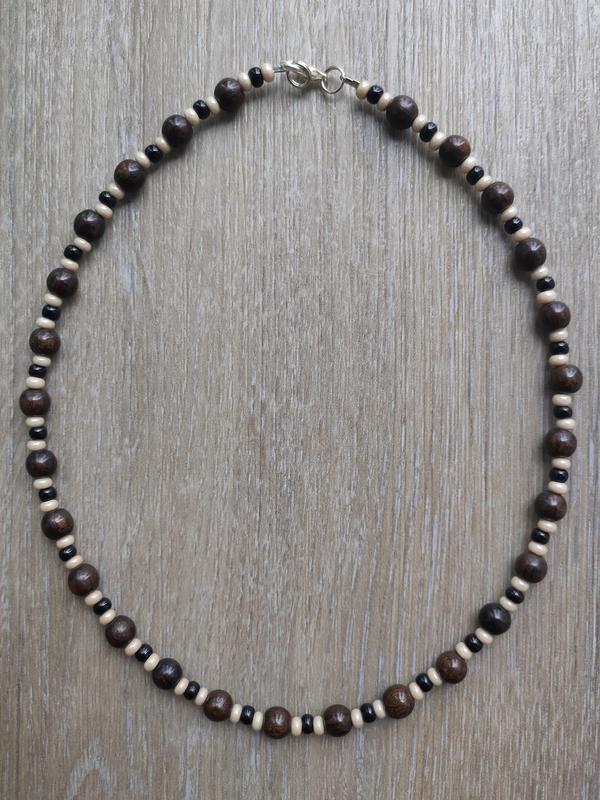 .Продам лаконічний, стильний чокер з намистин вишневого дерева ручної роботи та чеського бісеру кремового і чорного відтінків, унісекс. Довжина чокера - 43 см, нанизаний на ювелірний тросик, застібка - карабін. При необхідності можу поставити подовжувальний ланцюжок або збільшити розмір самої прикраси. По всім питанням пишіть в особисті повідомлення - відповім.