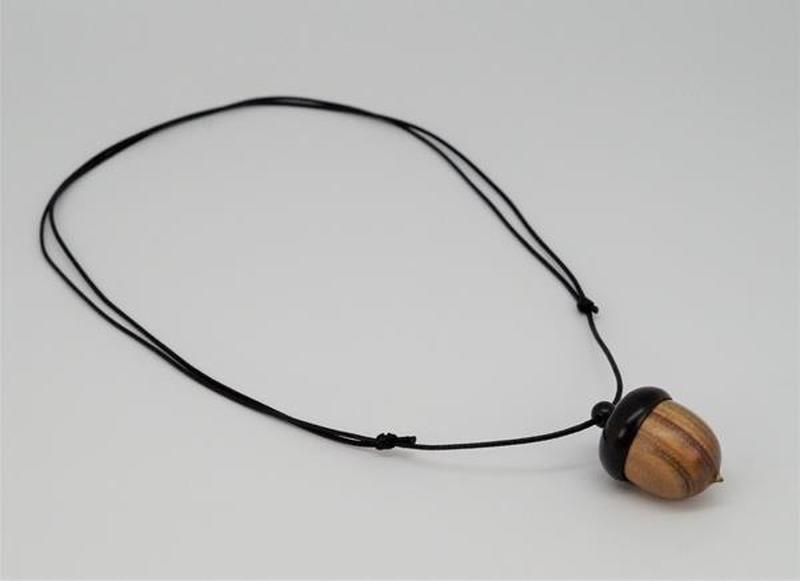 Кольє шовкове з кулоном "Жолудь-2". Довжина кольє регулюється затягуванням, кулон виготовлений із натурального дерева з гарним обробленням і поліруванням, кришка жолудя (так само виготовлена з дерева) відкручується й сам жолудь являє собою капсулу для зберігання чого-небудь. Висота кулона 3,07 см., ширина 2,11 см., загальна вага кольє 5.00 гм., колір — горіх.
