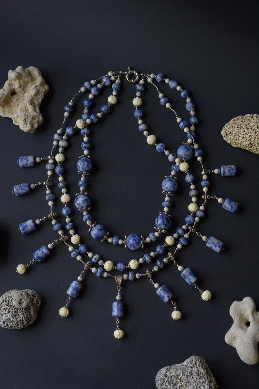 Багаторядне авторське кольє з натурального каміння☝ (Содаліт, білий корал-троянди, туркеніт) Вам подобається бархатистий відтінок синього, в якому глибина переливається фіалковим відтінком - тоді содалити буде вашим улюбленим каменем.💙🙏 Подивіться на сонце через це каміння - глибокий магнетичний колір і напівпрозорі ділянки - він зачаровує. 🙌 Білі коралові троянди розсипом лягають у космічному просторі чарівного содаліту🤍💙 Білий корал та натуральний содаліт – оригінальна прикраса, яка доповнить Ваш образ.👌 Чудовий подарунок для коханої.🎁 🤍 Корал традиційно вважається дуже сильним оберегом. Камінь щастя та довголіття. Білий корал був символом непорочності та чистоти намірів. Магія каменю пов'язана з позитивним впливом на стан його власника. 💙 Содаліт - символ чистого почуття, відкритої душі і великодушної мудрості. Примірники з космічним синьо-білим забарвленням вважаються провідниками до відкриття нових рівнів свідомості та високо цінуються адептами медитативних практик. 📐Довжина кольє: 43 см Можна поставити подовжувальний ланцюжок 5-7 см