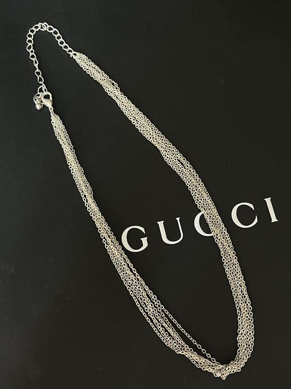 Колье из многих цепочек, серебристый цвет. Не длинное, не массивное, красиво смотрится как самостоятельное украшение. Без дефектов. Можна носити як браслет, два рази обмотавши руку. Длина 46см