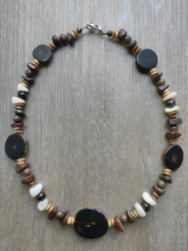 Продам унікальне авторське намисто/кольє в етностілі. Виготовлене з натурального рогу, слонової кістки, намистин рідкісного тибетського агату та перламутру. Нанизано на ювелірний тросик, застібка — карабін. Виготовлено в единому екземплярі. Довжина із застібкою — 42 см. З усіх питань пишіть — відповім.