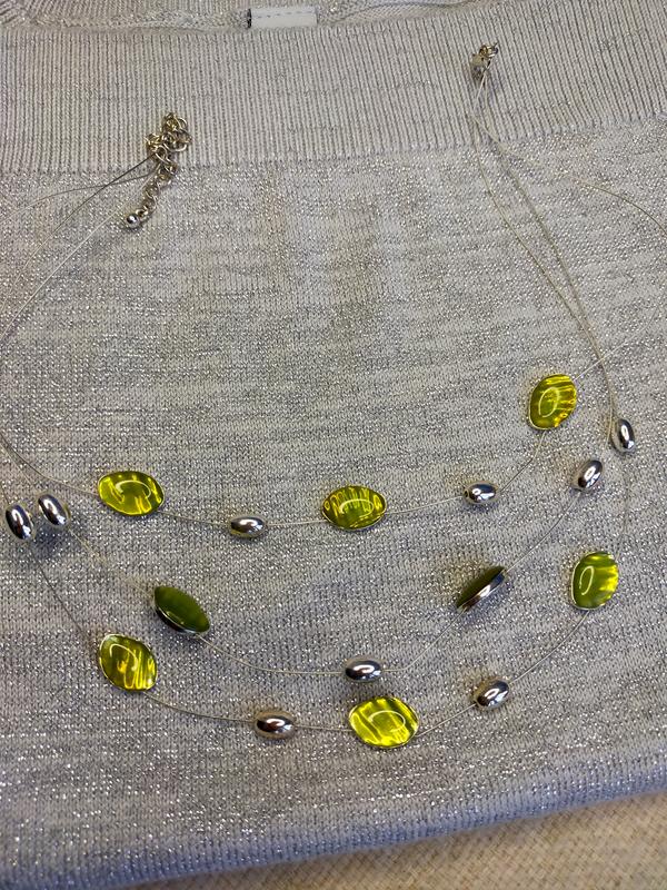 Кольє трьох-шарове. З металевими намистинами. Та Салатові, схожі на галіотіс.Треба вирівняти лєску. Довжина коротшої-39,5+8см.