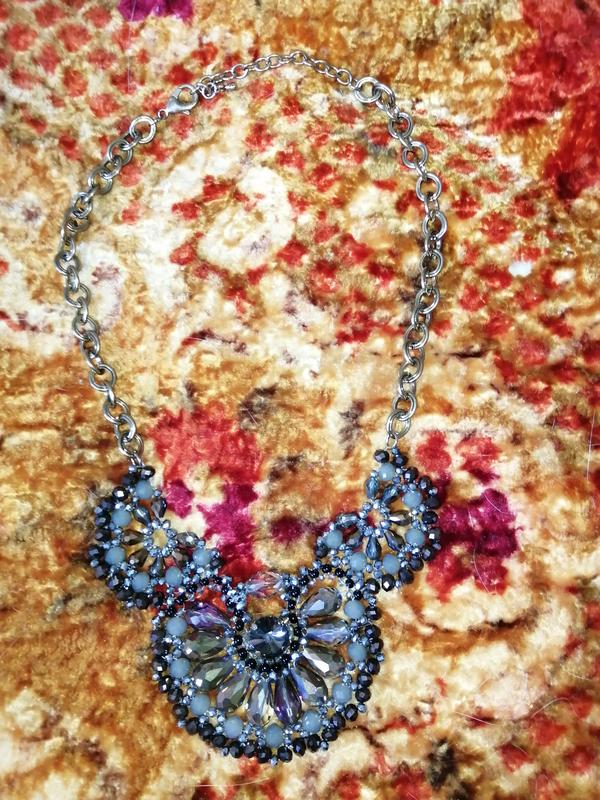 Оригинальное изящное колье на цепочке. Чешское стекло, камни сваровские, цвет дымчатый с отблеском красок