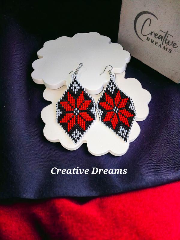 сережки ручної роботи виконані з якісного чеського бісеру. Довжина 7 см, ширина 3.5 см. За деталями звертайтесь в повідомленні,з радістю відповім.