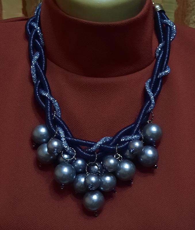Интересные бусы на многослойном переплетенном шнуре с шариками синего цвета.