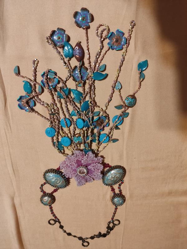 Это колье принимало участие на международной выставке по украшением ручной работы и заняло 2 места. Цветок выплетенный из чешского и японского бисера с серединкой из искусственного хрусталя. Все кабоны, цветочки и листочки бирюзового цвета сделаны вручную из полимерной глины. Цветок диаметром 8см, крупнейшие кабоны 6х4см, цветки 2,5 сме. Длина колье 85-100 см.