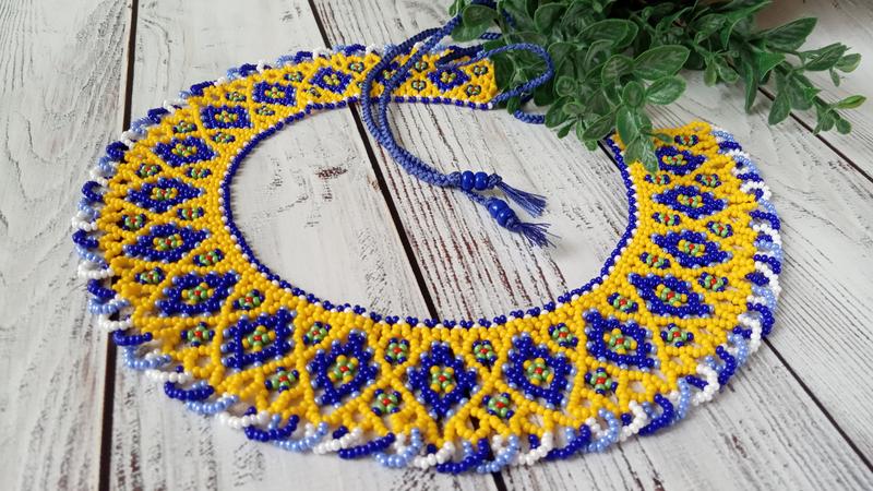 Довжина силянки навколо шиї -39см. Ширина силянки -4,3см. Зав"язки по-30 см, ними зручно регулювати довжину. Чеський бісер, міцна нитка. Виготовлення на замовлення, 4-5днів