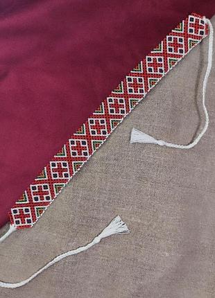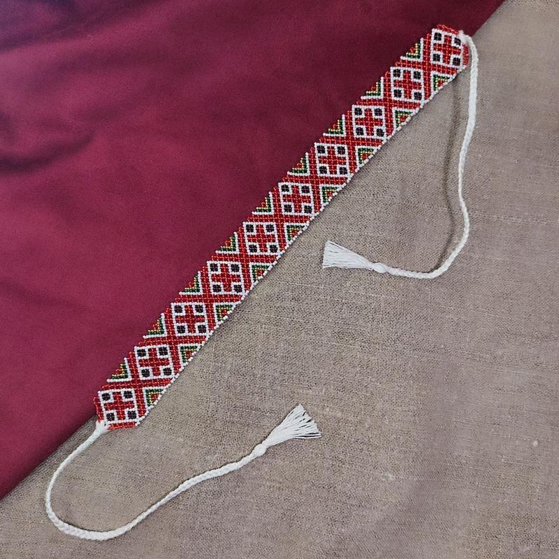 Стрічковий ґердан з українським орнаментом на зав'язках, виконаний з японського бісеру Matsuno, має яскраві і насичені кольори Довжина бісерного полотна - 34 см, всього виробу разом із зав'язками - 86 см. Ширина виробу - 3,5 см.