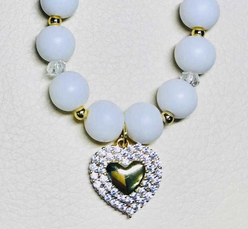 Кольє з агату з підвіскою символом любові Агат-символ достатоку, допомагає набути душевної та сімейної гармонії, є оберегом. Кольє: -агат 8мм -намистини скляні -бусини 18К -підвіска 15мм*16мм: циркон -довжина кольє з замочком 42см+5см подовжувач -фурнітура 18К Пакування: подарунковий мішечок Догляд: берегти від потрапляння води, косметичних засобів, зберігати у мішечку. Ручна робота.