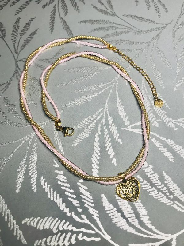 Світло рожеве з золотавим кольє з бісеру з символом любові