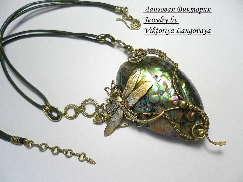 Кулон Пауа. Виконаний в техніці Wire wrap, з латуні, з використанням раковини пауа, або гелиотис, і шкіряного шнура. Патинований і розкрита лаком. Розмір кулона - 6,5х6,5 см, довжина шнура - регулюється. Додаткові характеристики: Колір: Зелений Матеріал: Металева фурнітура Матеріал: Натуральна шкіра Матеріал: Дріт Матеріал: Черепашки Товар виготовляється на замовлення
