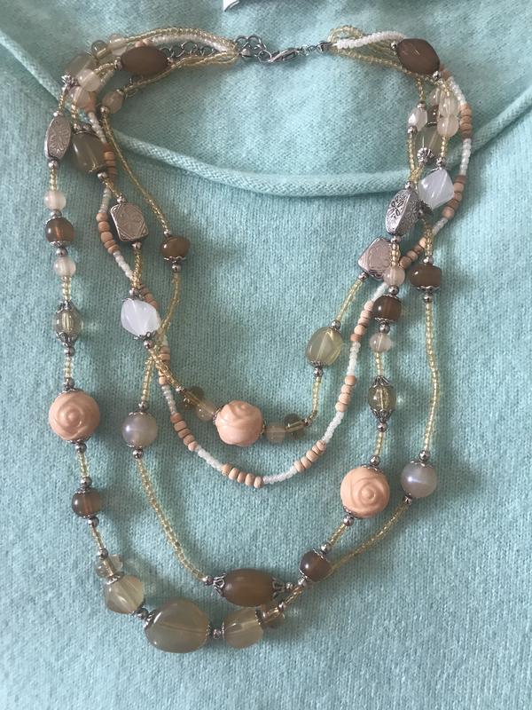 Коротке кольє в бежевих відтінках із акрилових намистин,бісеру та дерев‘яних намистинок,довжиною від 35 до 46 см. Схоже на натуральне.