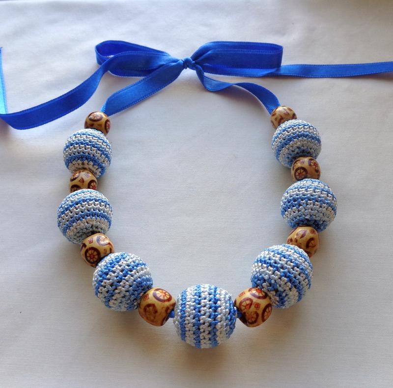 Слінгобуси - багатофункціональний прикраса - модний аксесуар і помічник для матусь. Чудово доповнить ваш наряд - додасть святковий вигляд, відчуття теплоти і комфорту. - Слінгобуси "Біля моря". - Створені з синтетичної нитки. - Прикрашені декоративними намистинами. - Сім - обв'язаних намистин; вісім - декоративних. - Намистини насаджені на міцну яскраву стрічку. - Додатково можна замовити сережки. Створіть ансамбль з декількох прикрас.