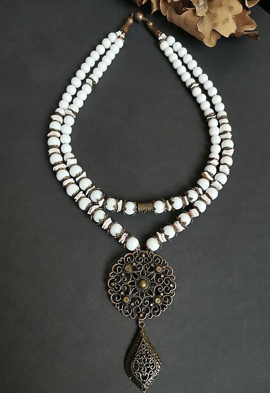 Колье в этностиле из агата, ракушки, медной фурнитуры