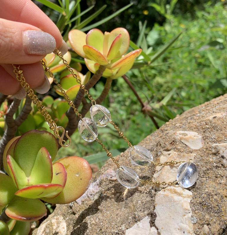 Витончене намисто ручної роботи як ланцюжок з натуральним гірським кришталем (1,2 х 1,7 см) повністю на фурнітурі з ювелірної неіржавкої сталі золотистого кольору. А це означає, що фурнітура не іржавіє, не викличе алергію й дасть змогу цій ніжній прикрасі довгі роки тішити свою господиню! Довжина по шиї 40 см, носять під самою шиєю, як чокер. Камінь натуральний фриформ, з природними тріщинами та домішками! Гірський кришталь — мінерал універсальний, він підходить усім знакам зодіаку. За твердженнями магів, гірський кришталь допоможе своєму власнику знайти душевну гармонію, сконцентруватися, прояснить свідомість і поліпшить роботу мозку. Камінь навчить регулювати та правильно використовувати внутрішні сили та вбереже від негативного впливу ззовні.