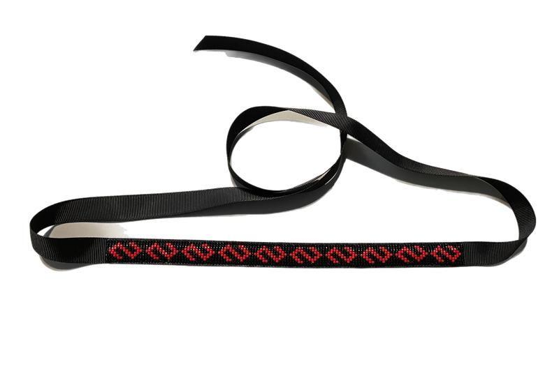 Стрічковий гердан з S-очками (символ земної води, всього, що живить і надає сили). Ширина 1,5см, довжина вишитої частини 22см, стрічка загалом 100см. Бісер Miyuki Delica, герданне плетіння, репсова стрічка. 700 грн