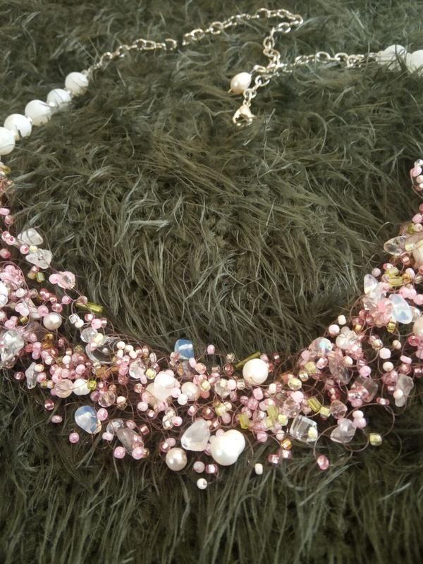 Повітряне кольє " чайна троянда" з натуральними камнями розового кварцу, агату, річних перлин, чеського і японського бісеру Додаткові характеристики: Камені / вставки: Перли
