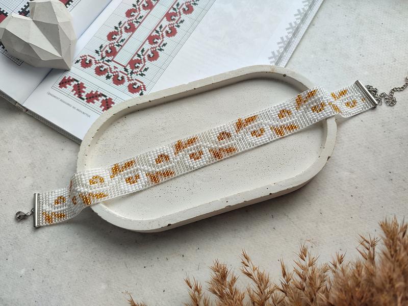 Орнамент гердана взята из вышивки женской рубашки из Волинского Полесья, Равноренской области. Схема орнамента из книги Лидии Бебешко <unk> Украинские вышиванки: орнаменты, композиции<unk>. Материалы: чешский бисер, фурнитура из медицинской стали (прочнее чем обычный бижутерный сплав, не облезает, гипоаллергенна). Размеры: ширина 2.5 см, длина с фурнитурой 30.5 см. Размер подойдет на шею объемом от 31 до 39 см, благодаря удлиняющей цепочке (10 см), который регулирует длину.