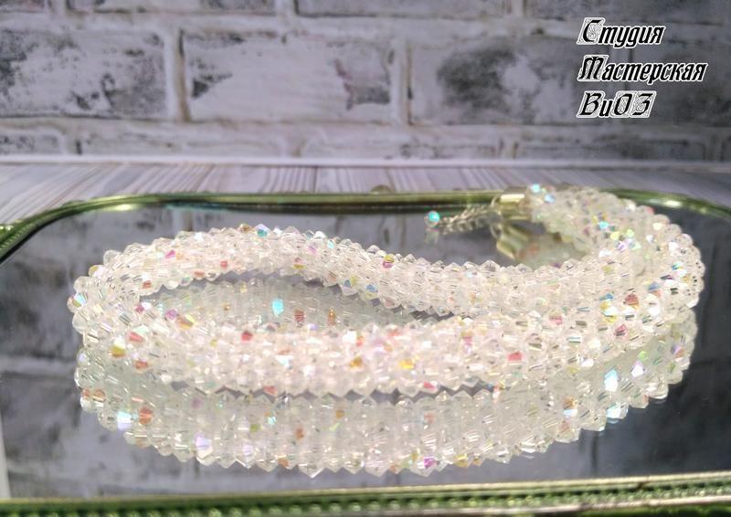 Набір складається з джгута і браслета.Пов'язаний зі скляних намистин з ефектом АВ Сваровські.Неймовірний блиск і гра відтінків на сонці.Призначений для будь-якої події : повсякденного,урочистого( може бути і весільним комплектом) Ціна за комплект : 800 грн Розгляну можливість продажу окремо