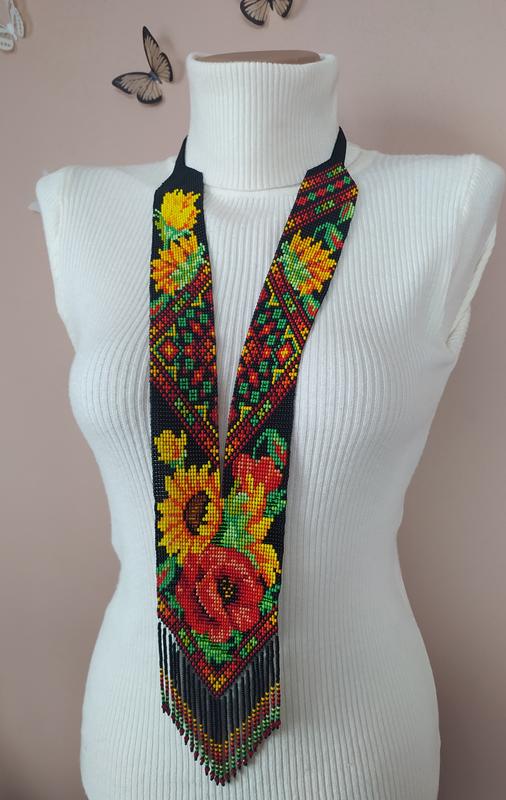Гердан виготовлений з чеського бісеру в техніці станочного плетіння за авторською схемою. Довжина намиста приблизно 55 см, ширина 7,5 см.