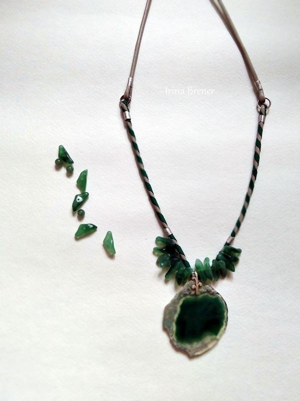 Зріз агату дивовижного смарагдового кольору, доповнений намистинами цікавої форми. Зібрано кольє на шкіряному шнурі ручної роботи. Ця прикраса приваблює поєднанням кольору та природними матеріалами.