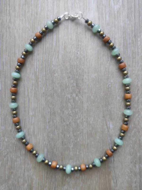 Продам стильний, лаконічний чокер з намистин натурального гематиту у формі диска, натурального нефриту, дерев'яних намистин ручної роботи та бронзових намистин, унісекс. Довжина чокера – 41 см, нанизаний на ювелірний тросик, застібка – карабін. Розмір намистин гематиту - 2×4 мм, нефриту - 5×8 мм, дерева - 5×6 мм, бронзових намистин - 4 мм. При необхідності можу поставити подовжуючий ланцюжок або збільшити розмір самої прикраси. З усіх питань пишіть в особисті повідомлення - відповім.