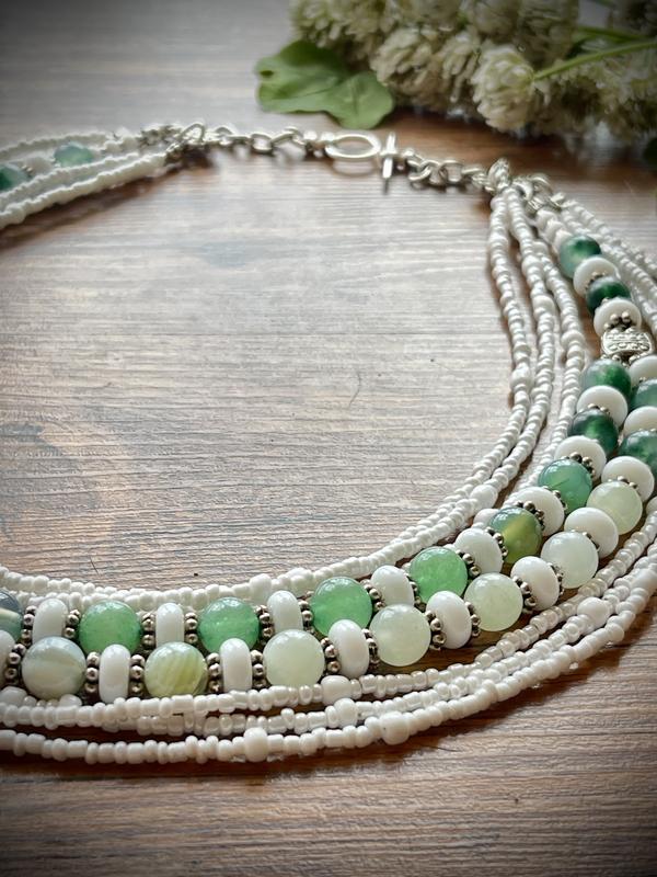 Намисто зроблено з каміння в зелених тонах-онікс, агат, нефрит, мармур, з порцелянових намистин та великого бісеру. На ювелірному тросику,замочок-тогл. Підійде і до вишиванки і до сорочки або сукні.Довжина по верху-45см,по низу-56см.