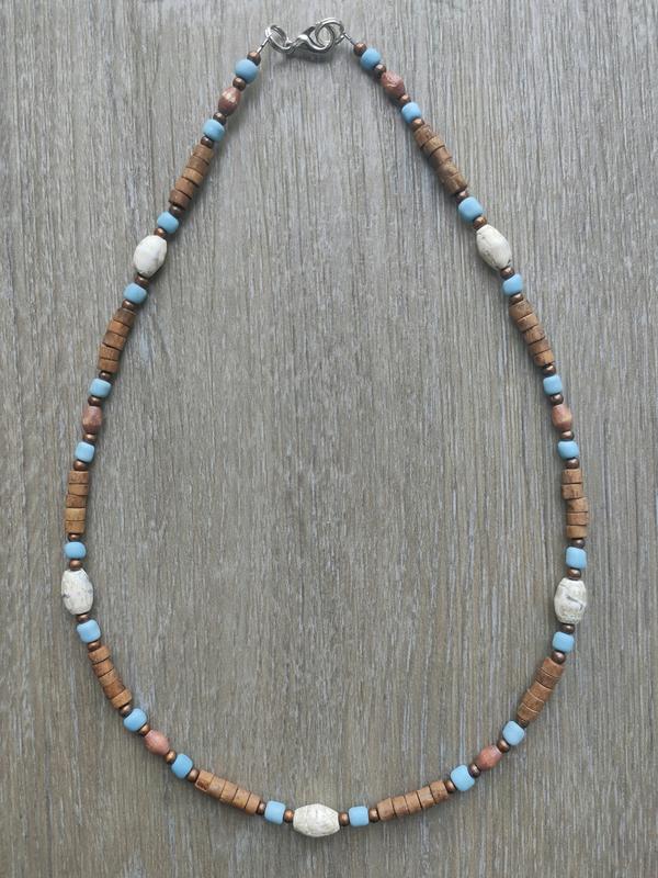 Продам етнічний, цікавий чокер з намистин натурального скам'янілого коралу, намистин із справжнього кокосу (шайбочки) та дерева (барильця), а також намистин з кераміки та металу, унісекс. Розмір намистин коралу – 6×12 мм, кокосу – 3×4 мм, дерева – 3×6 мм. Нанизаний на ювелірний трос, застібка – карабін. Довжина із застібкою - 42 см, можна збільшити розмір за допомогою подовжувального ланцюжка на Ваше прохання або змінити розмір самої прикраси. З усіх питань пишіть - відповім.