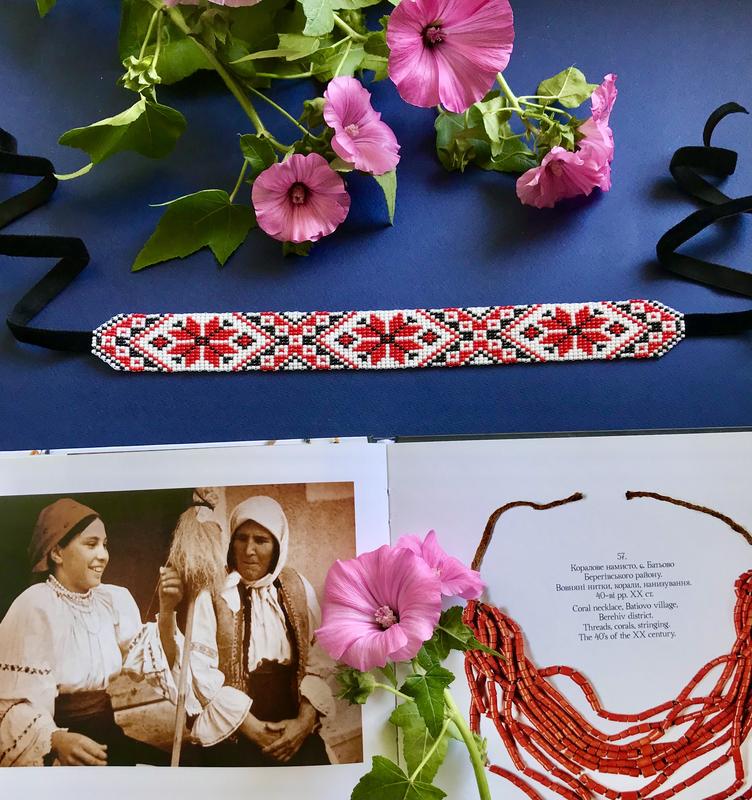 Бісерний гердан з традиційним візерунком. Ширина 3 см, довжина 28 см. Зав’язки з оксамитової стрічки по 35 см. На замовлення можна зробити інші варіанти кріплення: широка стрічка або застібка-карабін. Кольори також можна змінювати. Кастомізація не впливає на ціну. Оплата на картку Приватбанку або безпечна оплата через Шафу. Відправлення новою поштою або Укрпоштою