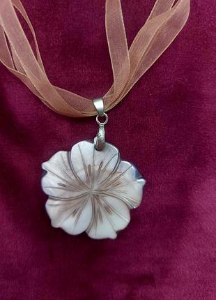 Замечательный колье- цветок из натурального перламутра. Диаметр цветка 4 см. Длина колье 43 см. Выгдядает стильно и непревзойденно.