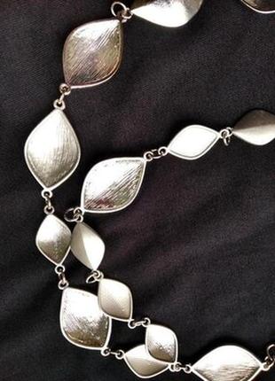 Кольє з білого металу, що складається з двох ниток. Застібка карабін, з підвіскою, є подовжувачі. Довжина кольє без подовжувачів 41 см, з подовжувачами 55. Стан нової речі.