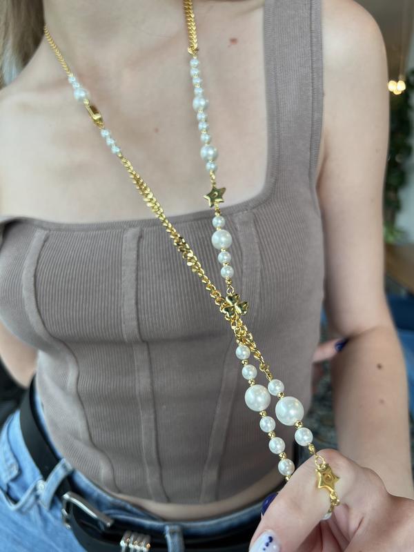 Подвеска диор с жемчугом и камнями длинная, позолота 18к
