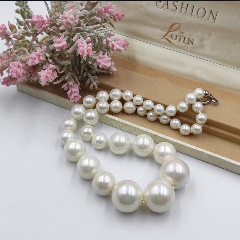 Шикарне масивне вінтажне трендове намисто із скляних "перлин". Європа, 90-ті роки Намистини гланцеві з легким напиленням Aurora Borealis. Діаметр найбільшої "перлини" 20 мм. Найменшої 8 мм. Намисто зібране на нитку. Довжина 49 см. Важке.