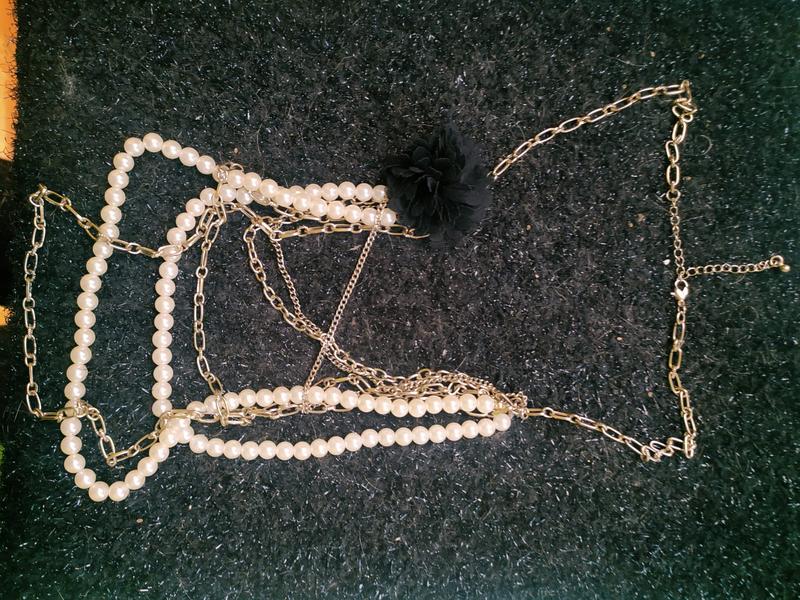 без потерь. Искусственный жемчуг , покрытие цепочек нежно золотое, цветок из очень качественной органзы под специальным креплением. Люксовая бижутерия с Англии. Длина 100 см.